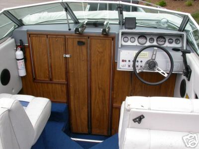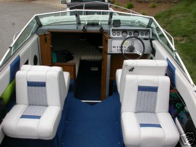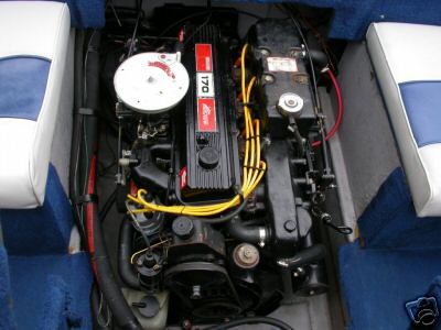 Powerplant. It has the 170 horsepower Mercruiser inline 4 cylinder engine with an Alpha 1 drive. Works well but not really enough sauce to pull up skiers fast. Nice fuel usage though. Can get a lot of play done over the weekend and never go looking for a gas station. The nice feature of this motor is that it is fresh water cooled. We can go out on the sound in the salt water and do a lot less damage to the motor and components because of this. You bet we are going to try this out before the summer is over.