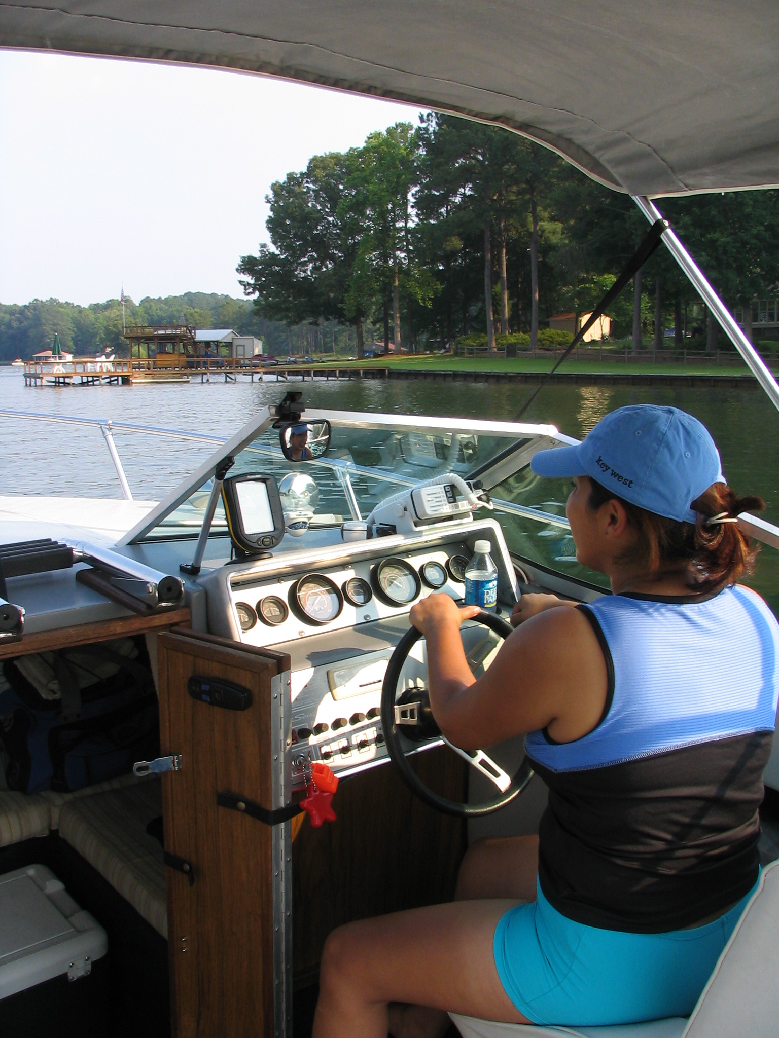 Mivon driving the boat. She took to that really fast which is a good thing since it means we both get to play off the back end on the tube, wake boards, or knee boards.