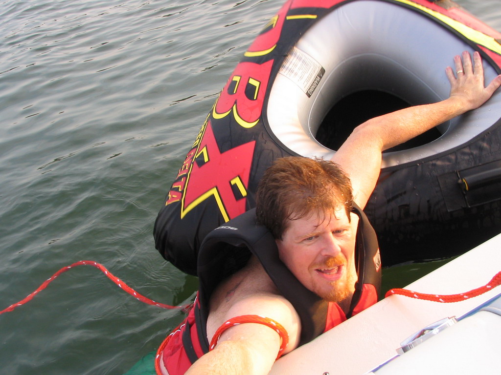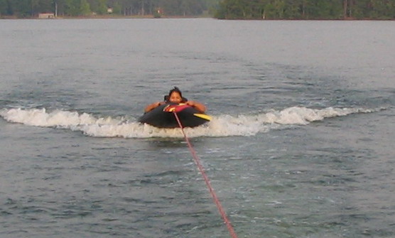Mivon behind the boat on the tube. Nifty toy.