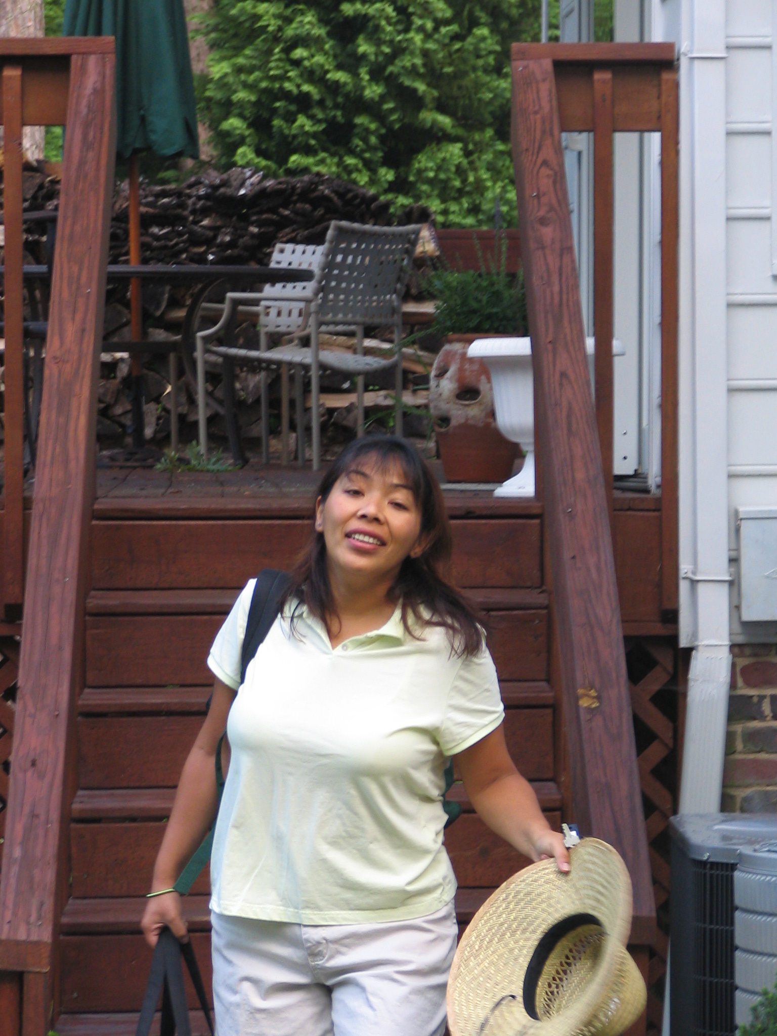Mivon with her hat, bringing out and loading the last of the goodies.