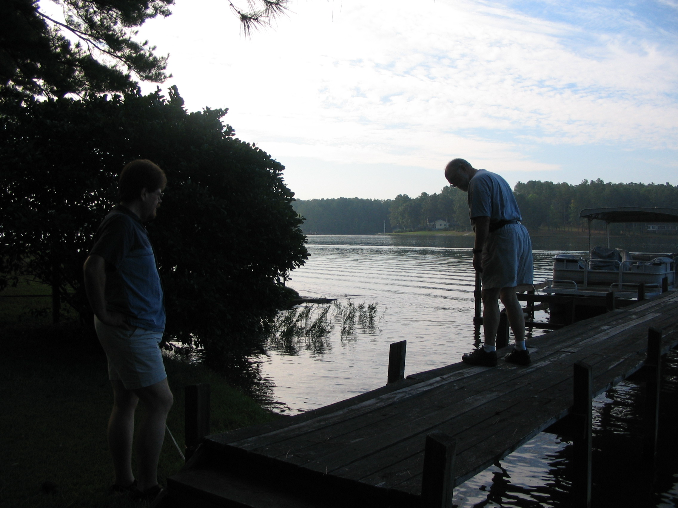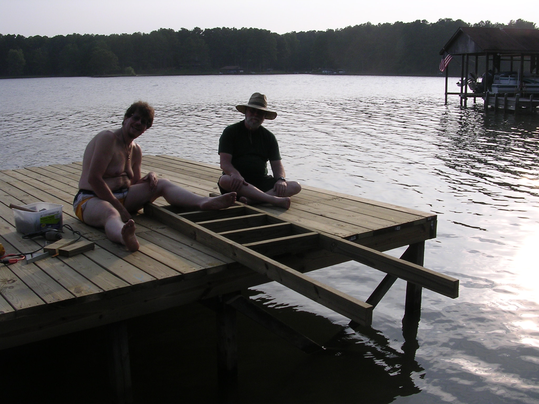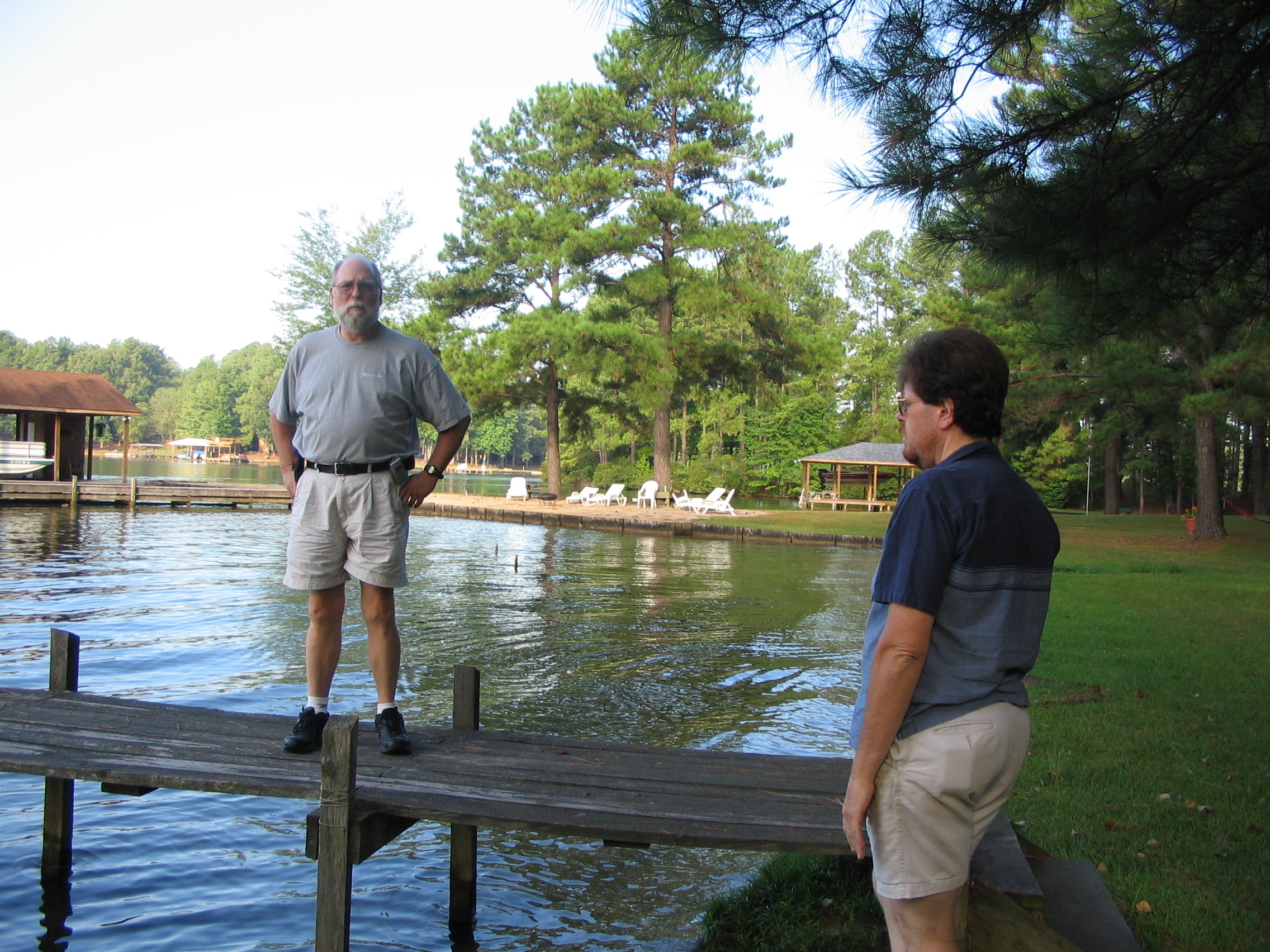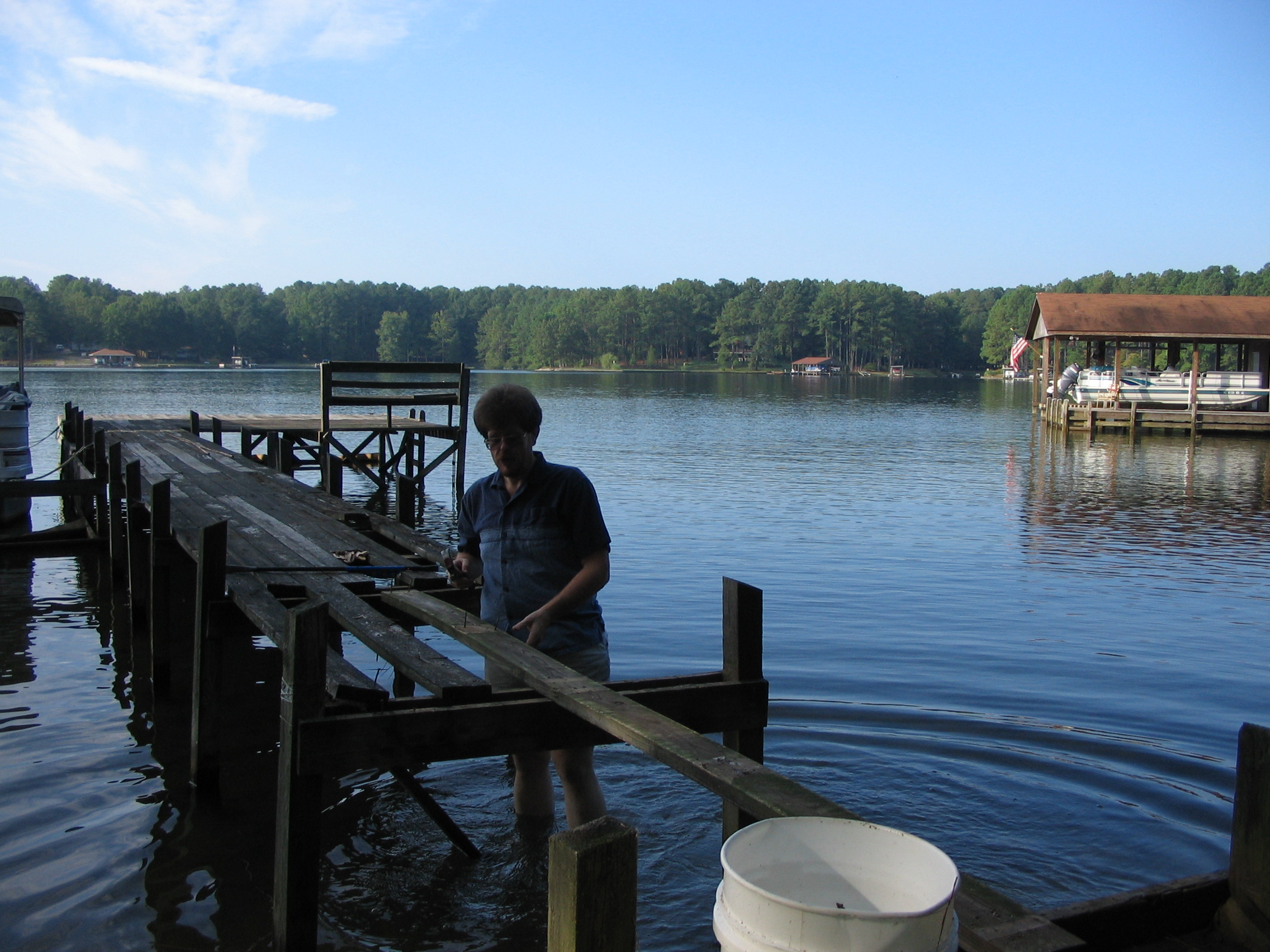 Bill and Evelyn Wesson requested some assistance rebuilding Bill's mother's deck. The deck at Jean's place on Lake Gaston needed some real help. Here Bill and I are looking at the current state of the dock and thinking about how the repair will get done.