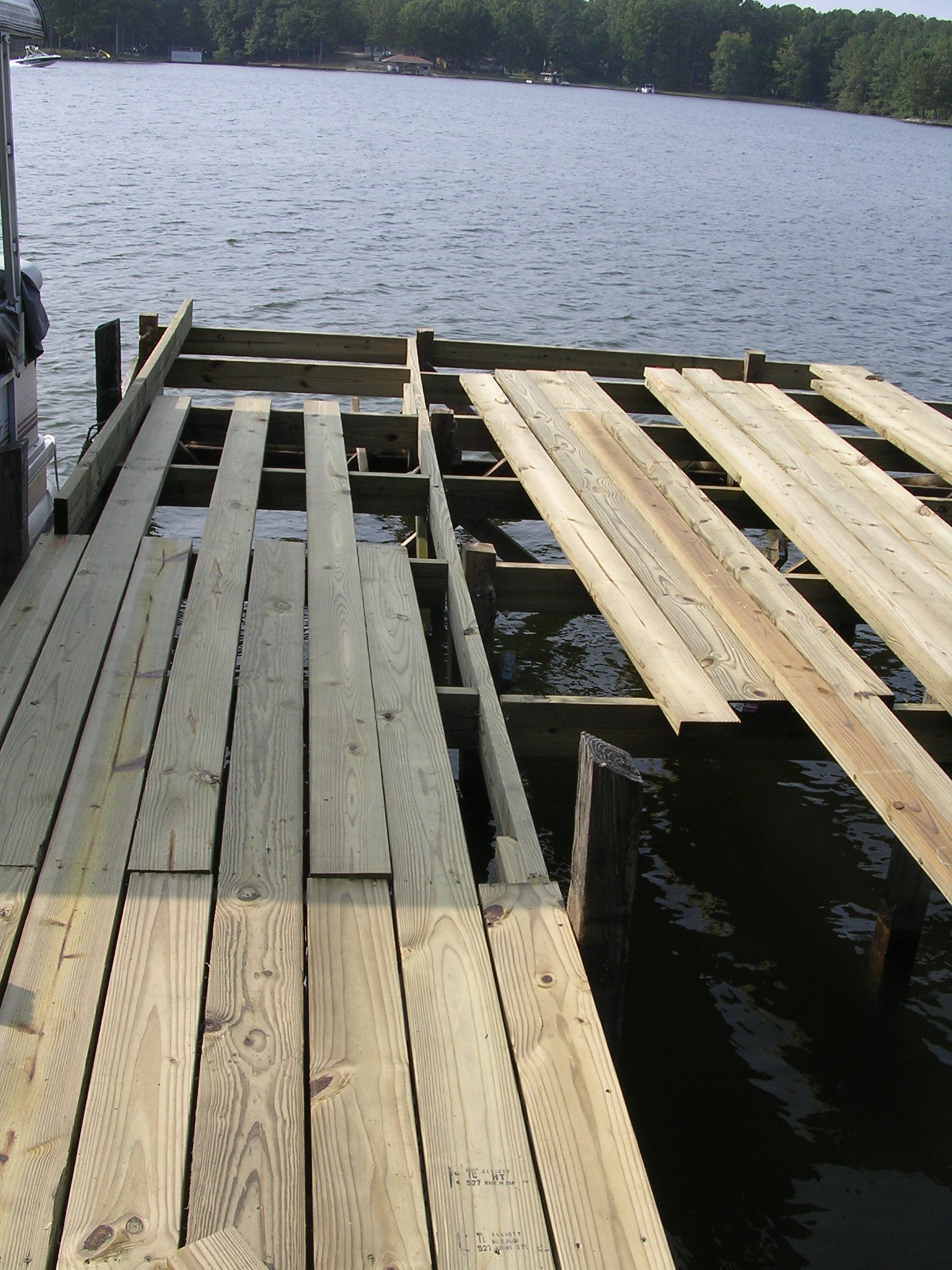 PS: Now that we have a boat and go to the lake, Jean likes us to visit and use the dock. We have made a final modification during the 4th of July weekend. The outside of the port side of the dock has been boarded up using 4 courses of 2x6 double thick to use as a docking location for any boat. Cleats have been added to tie up to and fenders placed so that damage can be managed.