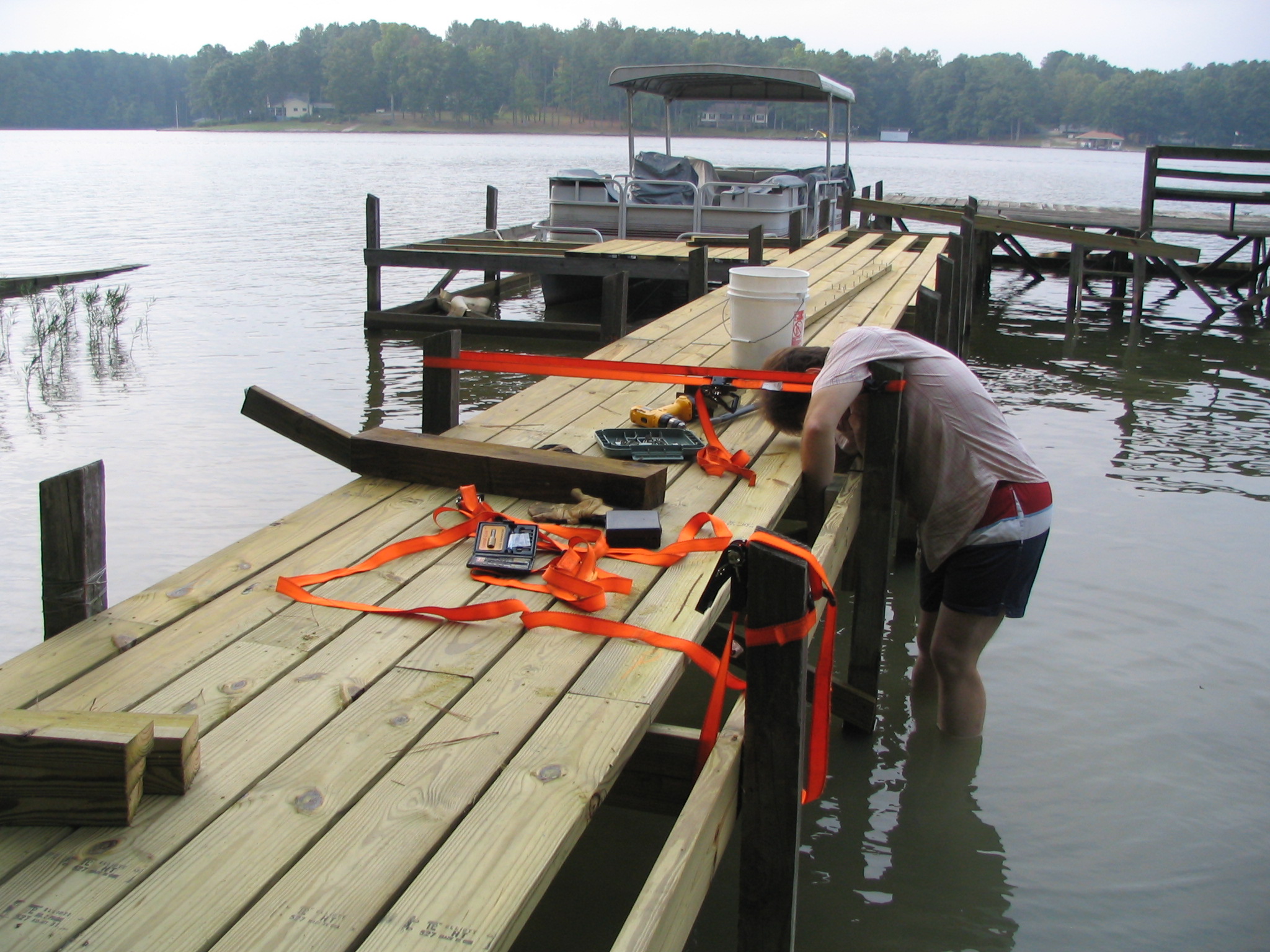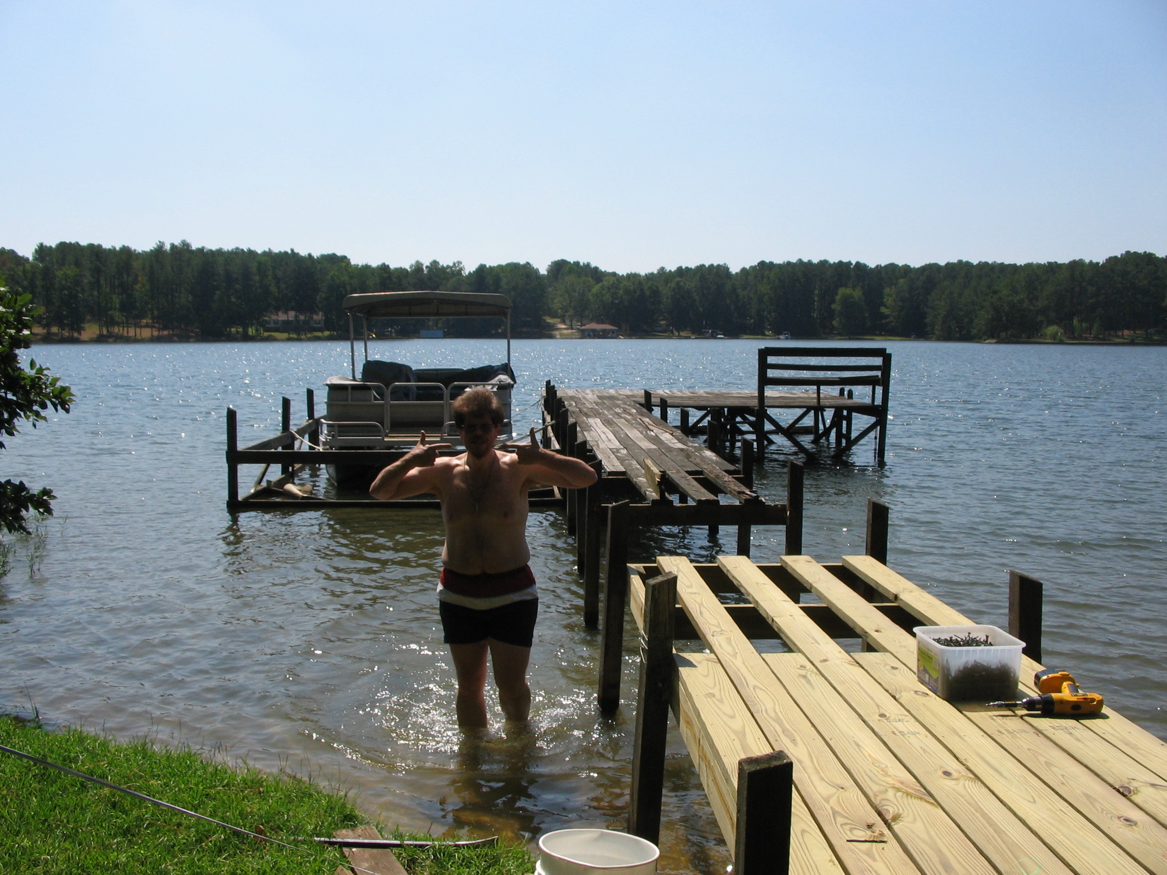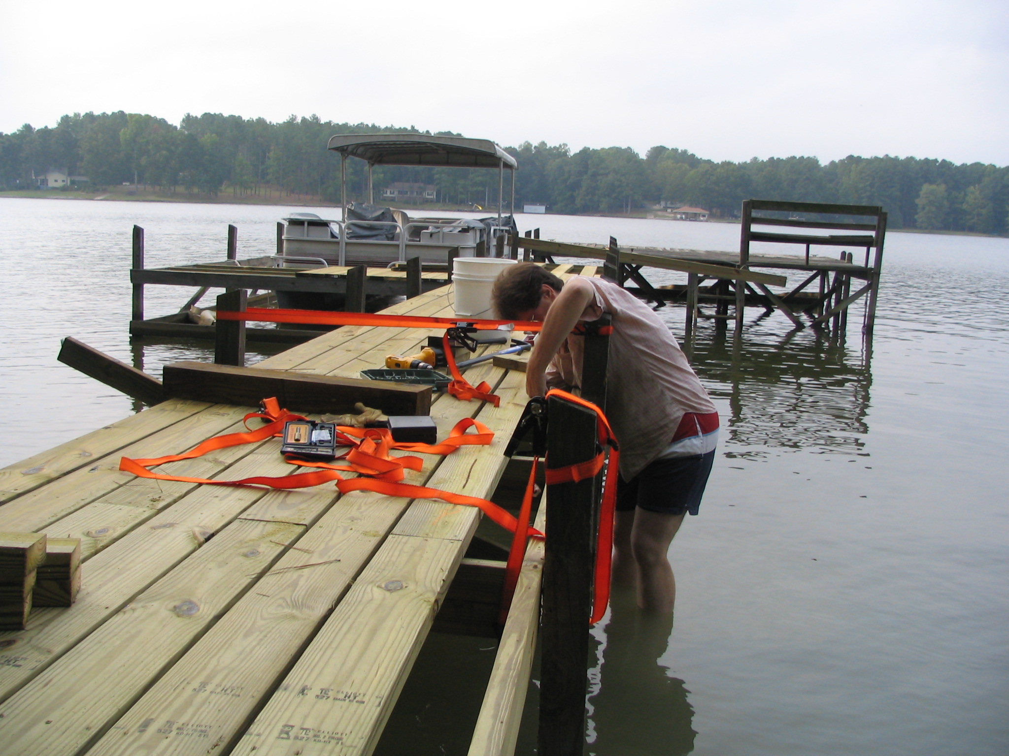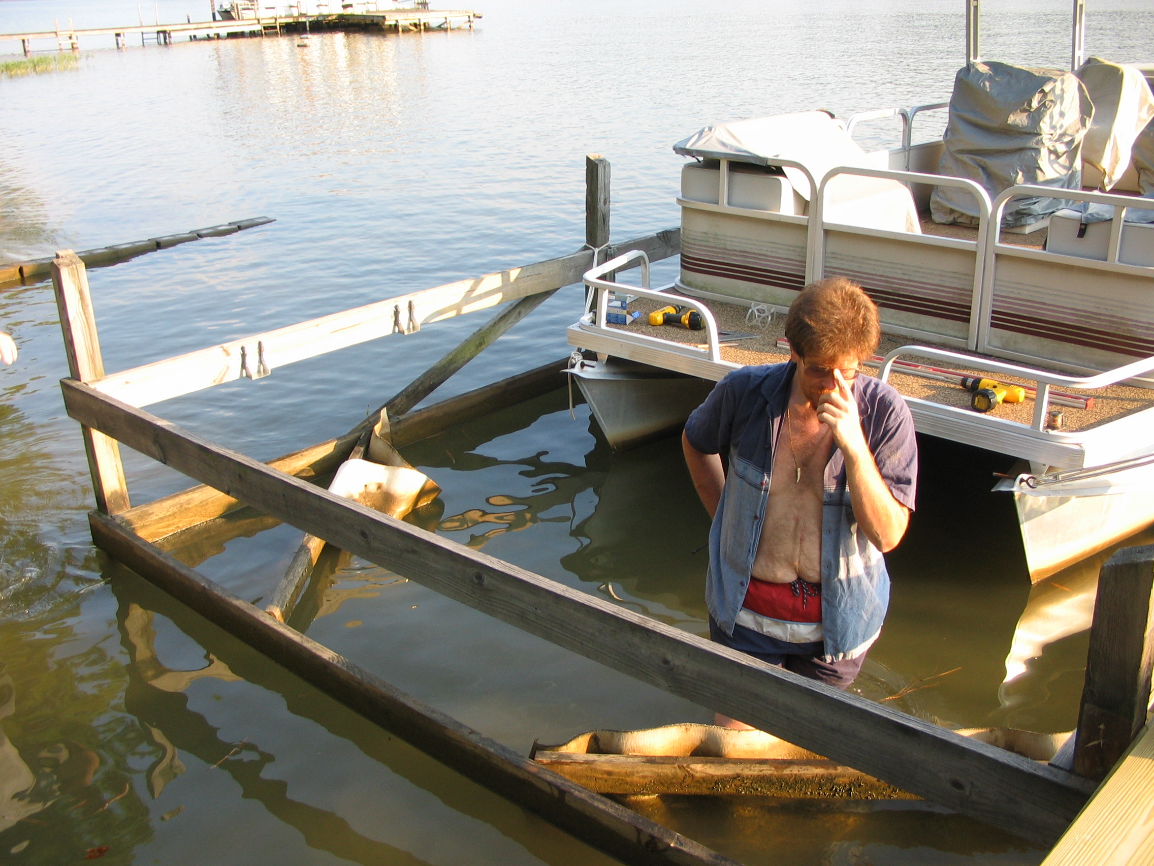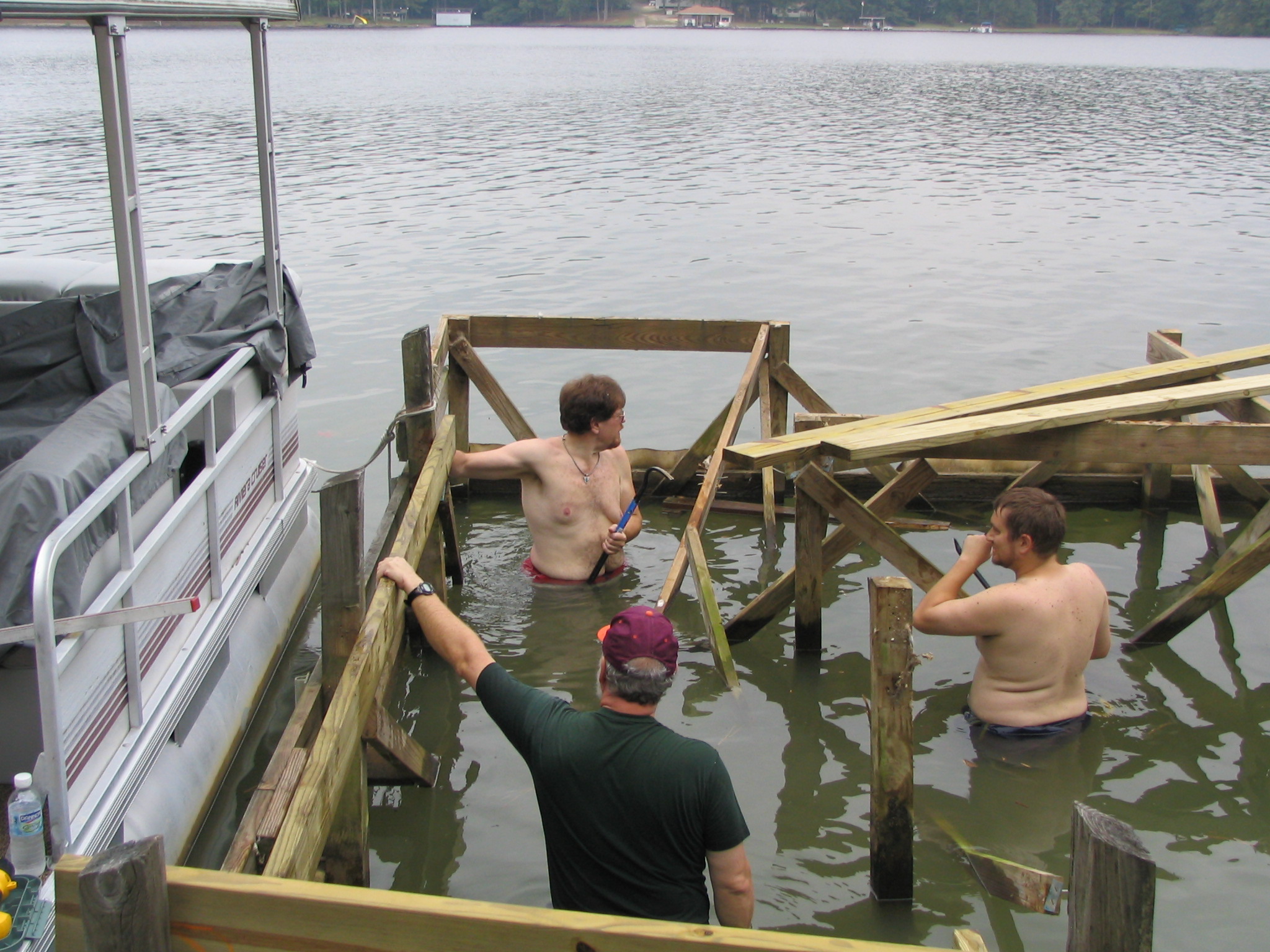 On the next weekend when we got there, we discovered a problem. The weight of the stacked 2x6 which was very wet was enough to force the dock downward and push out the 4x4 posts, ripping out the screws put in the previous week and dropping the built dock sections down several inches to over a foot. I was embarrassed. I should have thought of that.